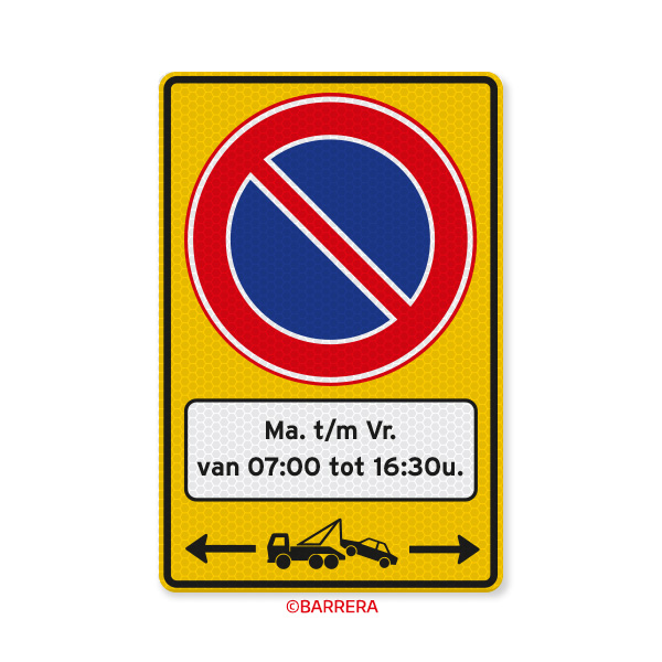Aluminium bord met een E01 afbeelding (parkeerverbod) en pijlen naar links en rechts op retro-reflecterende folie klasse 3.