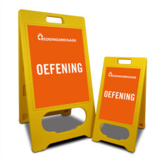 Het witte stoepbord is 114 cm hoog en 68 cm breed. Het weegt ruim 11 kg en kan bovendien nog worden verzwaard met droog zand.
