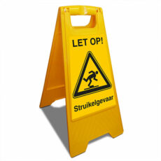 Uitklapbaar bord van geel Kunststof. Het te bestickeren vlak van dit bord is 74 cm hoog bij 49 cm breed. Gewicht 5 kg Hoogte 94cm, breedte 55 cm hoog.